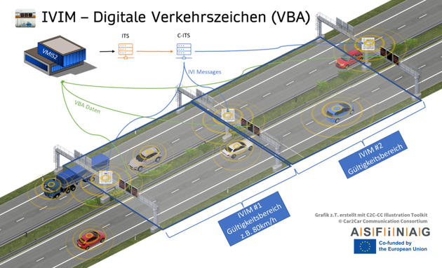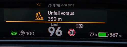Thanks to IVIM (In-Vehicle Information Message), the display in the vehicle shows the same as the overhead displays, e.g. speed limits, overtaking restrictions or other prohibition signs and additional texts ("in 500m")